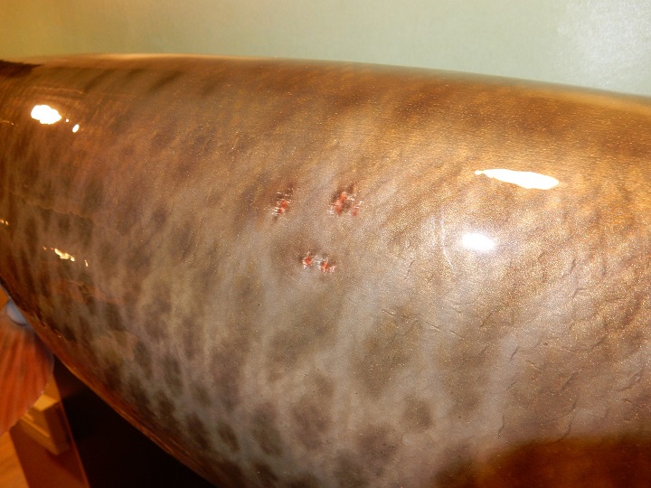 | Joe picked up on those things and incorporated them into the mount. To me, it is those small things that make this replica "my fish" vs. just some replica the same size as my fish painted quickly with no attention to detail. Here is the replica...