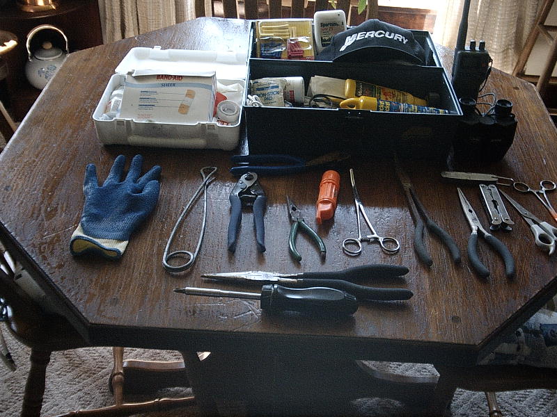 Location: Rhinelander, Wisconsin | What do you carry onboard your boat for a release and first aid/repair kit for your clients/tournament partners/guests and boat? I have a release kit with hook cutters, LONG pliers with different tips, a clipper for line, mouth spreaders, kevlar and rubber gloves, a length of line, sunscreen, insect repellant, antihistimine, aspirin, ibuprofen, extra sunglasses, an extra hat, electrical connectors and pliers, electrical tape, whistle, flashlight, Family frequency radio, portable ship to shore radio, full first aid kit, a multi tool, flares, and a multi tip srcewdriver. What else, or variations of this, do you carry onboard? I have all of this except the release tools in a gasketed dry box in the storage bin in front.