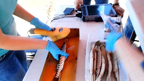 Olin Launch, Lake Monona – On November 2, 2015 the Capital City Chapter of Muskies, Inc. had a shipment of Leech Lake Strain muskies delivered to Lake Monona from the Minnesota Muskie Farm. The day was very sunny and air temps at 70 with strong southwest winds. That’s a far cry from the day we tagged two years ago where we had to be cautious of ice on the ramp. The MN Muskie Farm truck arrived at about noon and the WDNR was ready to go and do the PIT tagging. After setting up a holding net in the lake, we were able to transfer the fish from the truck to the holding net. Then the fish were drugged, fin clipped, PIT tagged, then measured. The fish were then placed into a large tank until they come out of the effects of drug. Then they were transported to another large tank in the WDNR boat and when enough were in the tank, motored out to weedy areas of the lake and set free. The WDNR staff on hand was Tim Simonson, Kurt Welke, Mike Rennicke, Lori Tate, Heidi Nelson, Bradd Sims, Kim Kuber, and Iyob Tsehaye. We also had some help from club members like Dave Lundey, Brett Cook, Duffy Kopf. Geoff Crandall, Lee Bartolini, Gerard Hellenbrand, and Gary Hoffman plus a good support of on lookers. In the end we PIT tagged 501 muskies that averaged 11.6 inches and the largest was 14.5 (and there were several around that size). It was noted that this year’s stock was much larger than the past few years They were placed into the lake and we did see one grabbed by a seagull and a few more may have also been taken by gulls. We had a maybe 4 or 5 that escaped the handling process prior to tagging. You know those muskies, somehow manage to get away. The Capital City Chapter would like to thank the WDNR staff for their help on this and the generous support received by its members and sponsors/donors.
