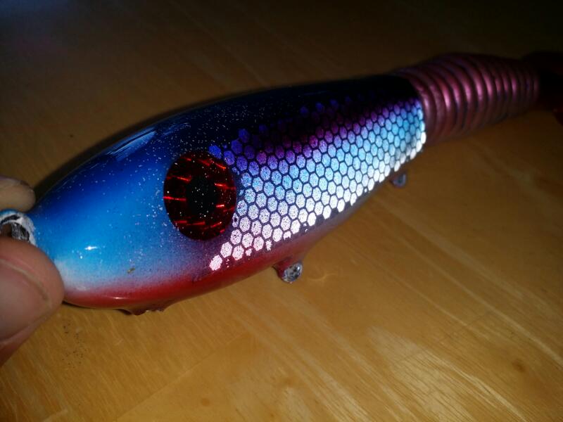 Location: Moses Lake, WA | I found this inexpensive reflective tape that had both a hexagonal scale pattern and internal lines of square reflectors. Photographing it proved somewhat tricky for my limited skills. The lure is a Grandma blank with a Jake lip. It photographed better in the dark than it did in the light.