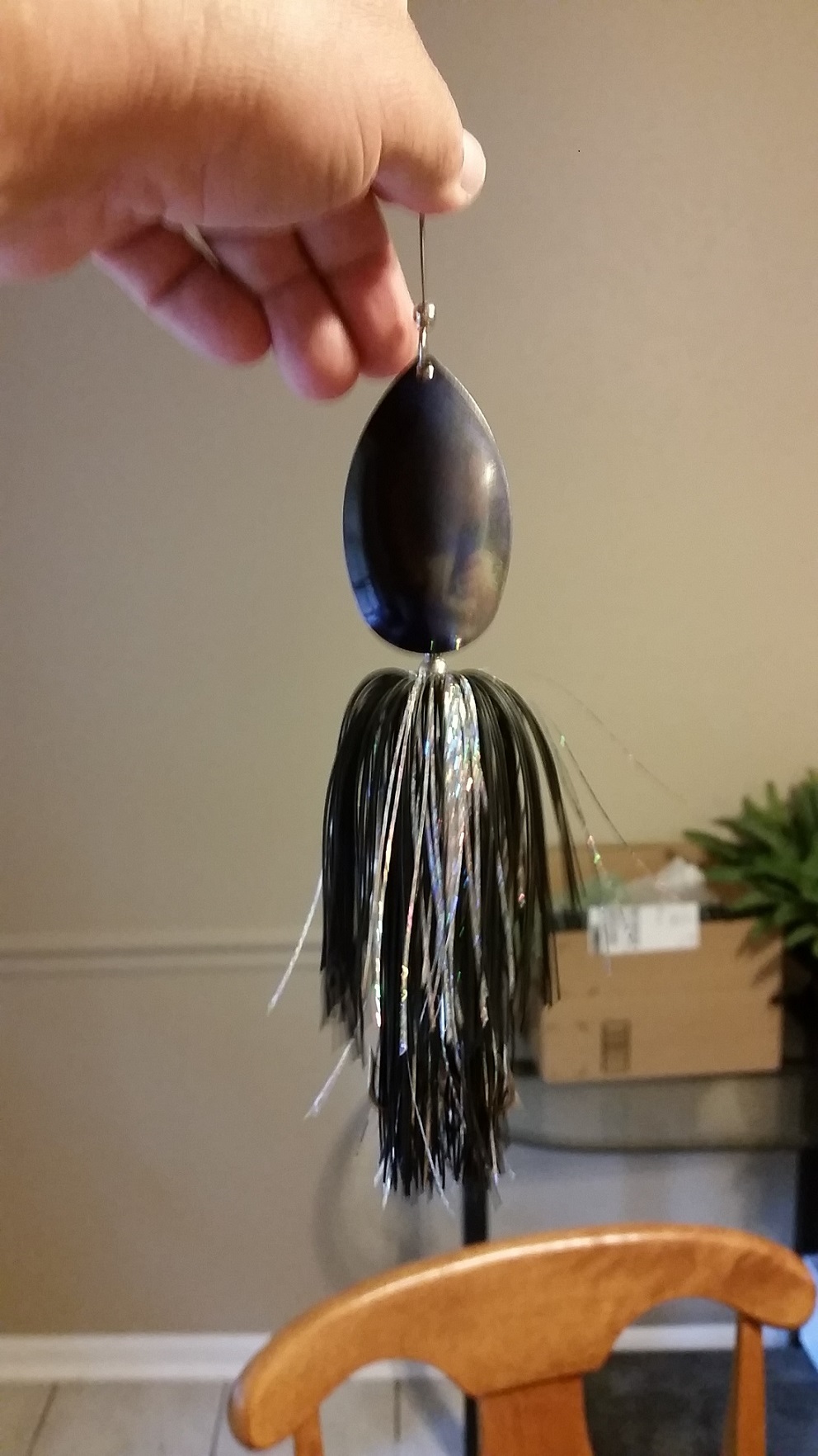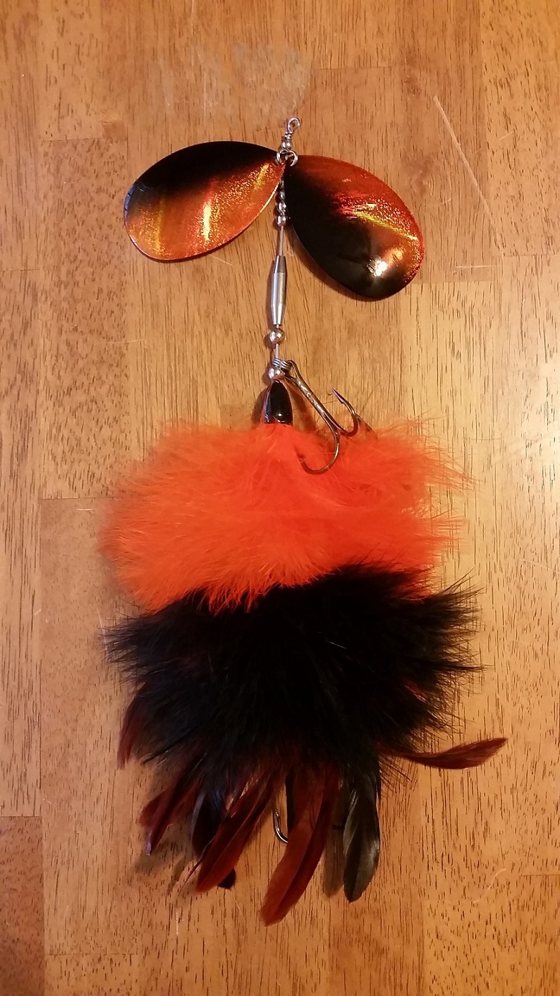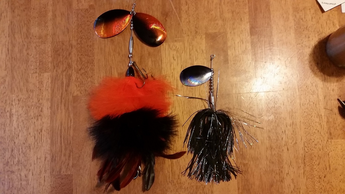 | I made these to donate for raffle. Not the best pics, but they run well. The Orange/black one has Mag 12 Indiana blades. Black rubber/Silver Flash has Mag 8 Indiana blades. Each bait is weighted with 1 oz.