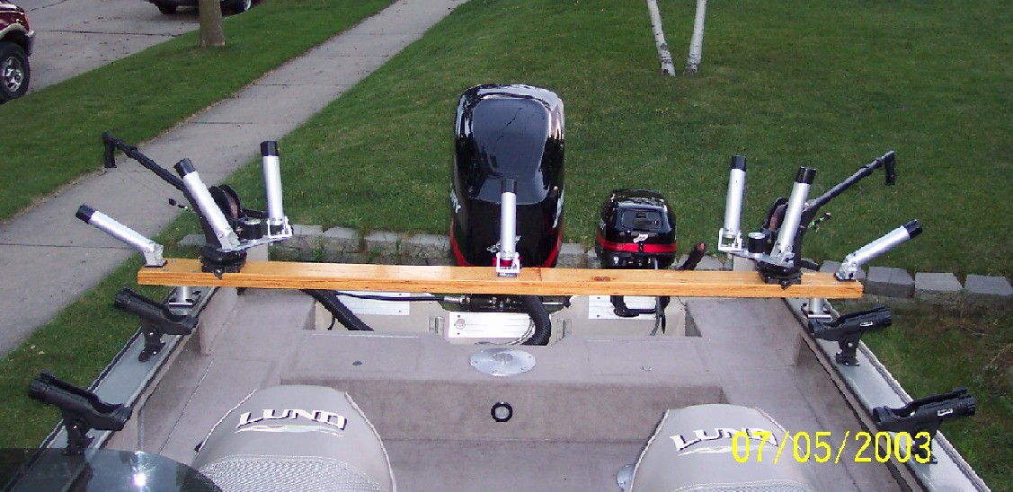 | The mounts from the board were adapted from Tite Lok triple mount rod holders from my last boat. All the parts would be available from Tite Lok. Works out very nice, and is easy to put on and remove. I just used what I had laying around, and it worked out good. I've seen a lot of different ways to mount riggers and boards. Perhaps somebody else has some ideas to help you out? Steve Worrall, where is the pic of your boat with the rigger mounting? |