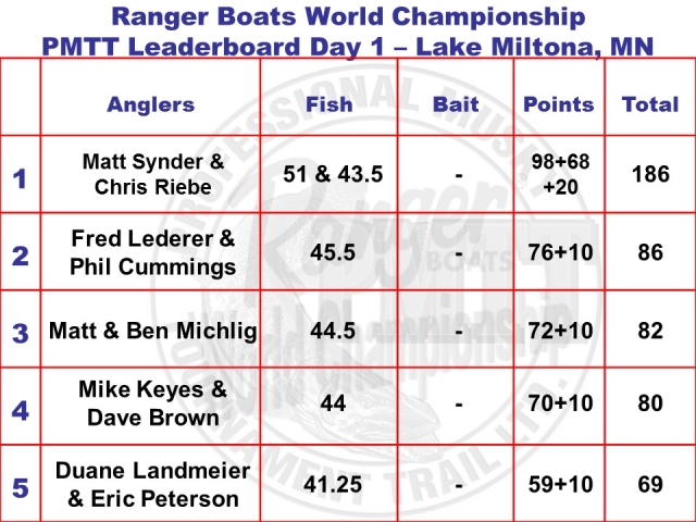 Location: Lake Tomahawk, WI | Day 1 Proved to be a tough one for anglers at the PMTT Championship on Lake Miltona with only 6 legal fish landed. Matt Snyder and Chris Riebe lead with a solid double of 51 and 43.5 inches. Tomorrow is looking like a slight change in weather conditions, so optimism is high for the good number of fish seen today to actually bit tomorrow. Stay tuned for up to date coverage from MUSKIEfirst.