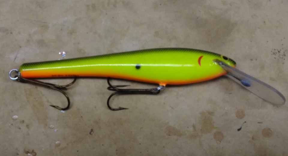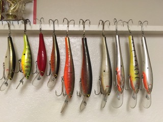 7- DB 6- old model thin lip - used - Perch yellow belly, TN shad, lg. mouth bass, all black, red craw, 2-chartreuse musky.