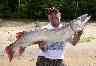 He beached his boat once she was in the net so he could handle her better. I think this is a great technique if the shoreline permits it. Get her out of the net and hold her in the water till she's ready to go. It sure would be a trip standing in the water with a big girl like that. |
