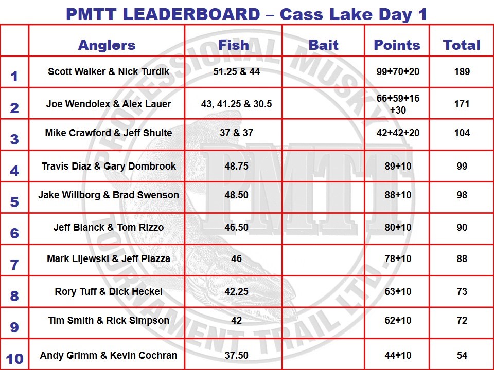 Location: Lake Tomahawk, WI | Scott Walker and Nick Turdik lead after day one on Cass Lake, MN with a 51.25 and 44 inch muskies. The day started with high skies with a big wind kicking in later in the day. 16 muskies were caught, and while Cass isn't known as an action lake the quality is definitely very good. Anglers were, as usual after day 1, very tight lipped about any sort of patterns/presentations they were using (can't blame them). Stay tuned for continued coverage through day 2 (Saturday).