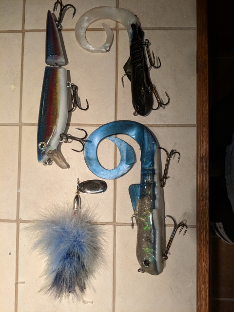 | Krisko is brand new from a raffle, never thrown but has a few small scratches. Mag dawg and blue for have been thrown in great shape. And the red tail is new in packaging. Looking for a yellow belly perch Bobbie bait, black nickel bucktails, pink bucktails mag dawgs, or will sell