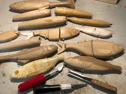 | I think that the right knives & tools are going to be fairly specific to the scale (no pun intended) of what you're doing as well as what woods you are carving. I've carved hundreds of baits, amongst other things, with a homemade straight knife and an exacto. The straight knife is for stock removal and rough shaping, the exacto for detail. For your shaping knife, you want something with a nice spine, but not too thick, something like a Sloyd knife, Frost/Mora sell inexpensive but good ones. A blade length of about 3" is a good size so you don't hit the hilt of the knife on the bait when carving side profiles on bigger baits. For detail, my preference is for the red or black handled exacto because they fit my hand well and can be manipulated easily. Sometimes, I switch to the pen style exacto but that's pretty rare. I use this combo of knives for all my baits unless I'm using something harder than maple. If it's harder than maple, then out come the gouges & small drawknives, spokeshaves etc. or the (uggh) power carver if I have to.