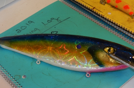 Location: Moses Lake, WA | A little mixture of everything - holographic siding, blue and yellow lacquer, blue, red, gold and pearl acrylics, 12" basswood, one rattle chamber.