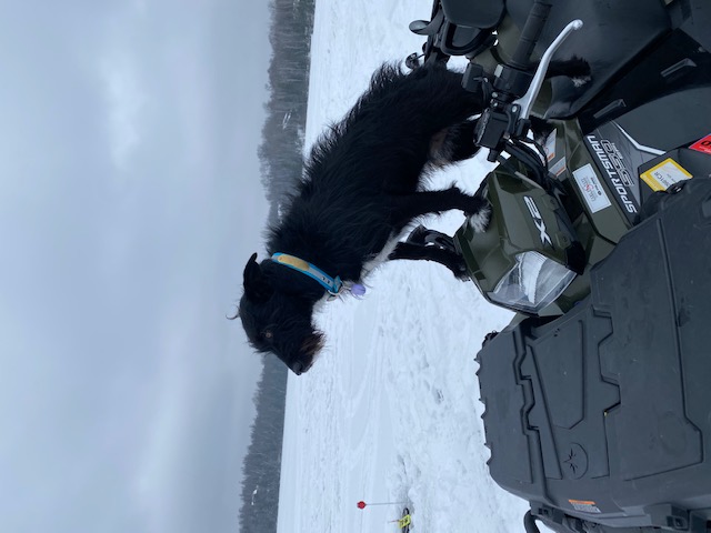 | This is Ollie waiting to check the tip ups! He has the same position in front of the boat, kayak... anything related to water and fish. He sees follows before I do!