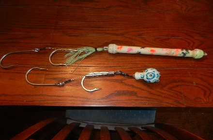 These are some jigs I've been making for halibut fishing in Alaska. The top picture is a "pipe" jig with a steel plug in it that goes clunk, clunk underwater when you jig it. Below it is my version of an "anti-shark" jig with a string of extremely strong rare earth magnets strung on the line of the bottom hook. The idea is that the magnets will overwhelm the ampulae of Lorenzini sensors on the sharks snout and drive them away. In the last 5-8 years blue sharks have become a real pain up in Sitka grabbing halibut baits dropped to the bottom and even eating some of he halibut being reeled to the surface.