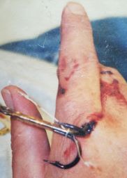 | Picture this... you're leaning over the boatside while using tools to unhook the fish. When the fish thrashes what do you do with your hands? You jerk them up and out of the way of course. But what if, as you jerk your hands up and out, a needle-sharp hook catches you while the fish is still hooked? The fish will continue to thrash, the hook gets buried deeper. Now you are in trouble and you have only one hand to solve your problem.