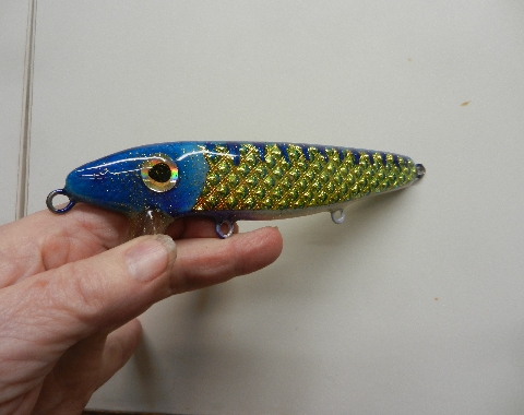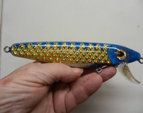 Location: Moses Lake, WA | Another 7" resin bait from mike Richardson with siding consisting of small pyramids. This material is typically used to make handbags for women but I like it for siding because it shifts from a gold color in normal incidence to a pale green at glancing incidence.