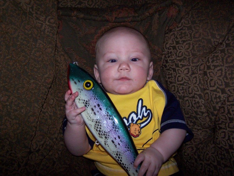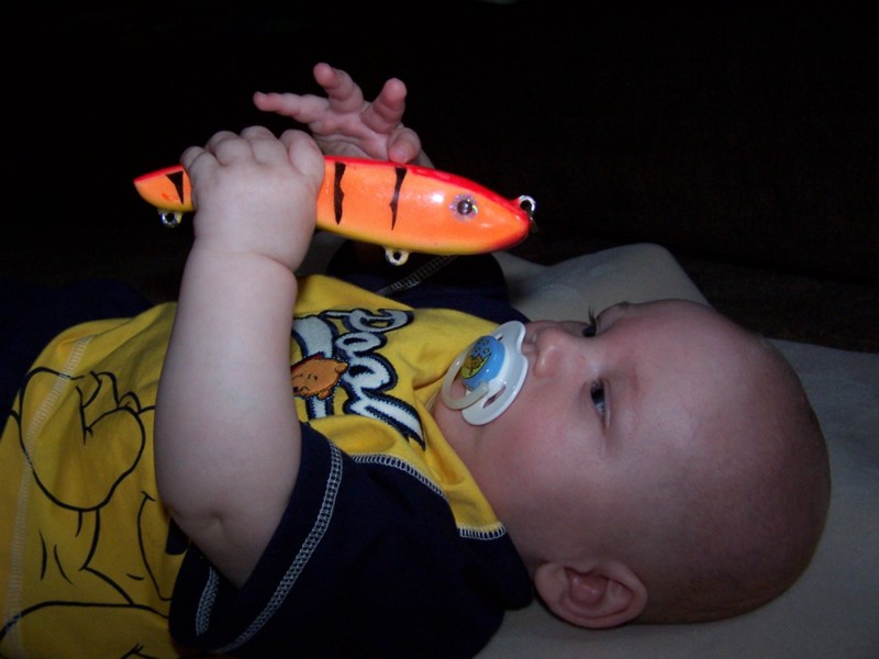 | Awesome!!!Whew, I'm glad I'm not the only one to give the babies hookless jerkbaits to play with.My daughter,who is 9, still has the 6"B-Flat she played with in her crib.They love hookless and "leadless" bucktails too. The more bushy the better.Very cute little boy Joe.You and Mama should be proud.Good luck this weekend! Steve |