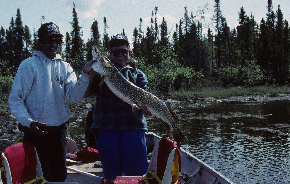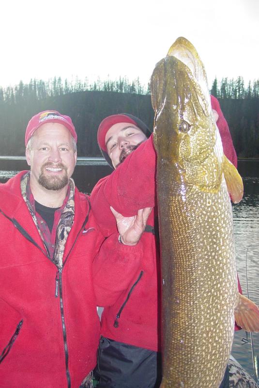 Location: Sakatchewan,Canada | Check out this pig that Rod Lewis caught Oct.11 2002 in far northern Saskatchewan on the waters i fish.Hunting camp owner Casey Richardson is holding the fish with the aid of Rod.
