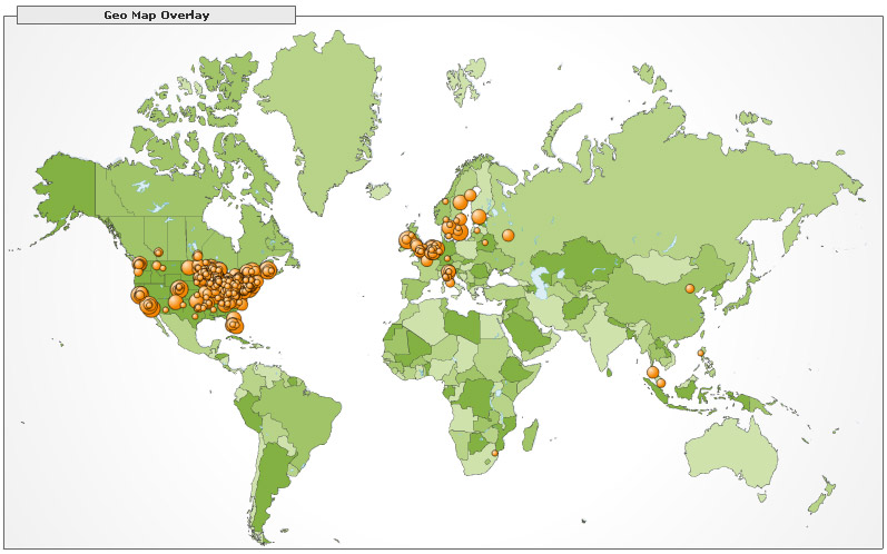 | Here is a current map for March showing the top 1000 geographic locations, the larger the circle, the more visitors come from that particular area. If I go any higher than the top 1000 locations the map gets too confusing.
