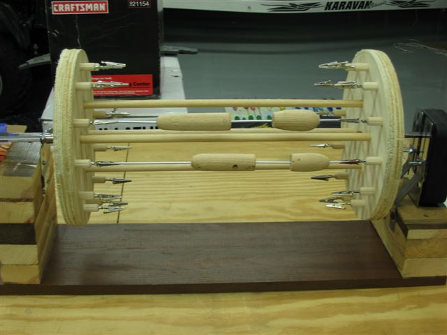 Location: Freedom, WI | I wear latex gloves and dip with my right hand and hold with the left. Them clamp a vice grip to the belly screw eye and finish smearing epoxy on. Then stop rack from turning (floor button) and hook it on. I will post a picture of my rack as soon as I can figure out how to get the file size small enough. It holds 44 baits.