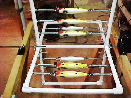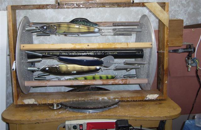 Location: Eden Prairie & Pine Island | I usually just use a slow RPM AC motor purchased on line or at a liquidator and rig it to BBQ spit (BBQ Rotisserie motors don't hold up for the number of lures I make); it ain't pretty, but it works pretty good. Here, however are a couple nicer ones I've seen and considered. One built into a blue storage tub and another built with PVC tubbing. Good luck.