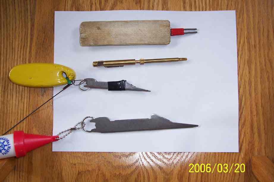 Starting from the bottom -> I discovered the Tie-Fast tool ~ 12 years ago at a fishing show in Seattle WA. The tape on the smaller one is only to make it more comfortable to hold. These are my main knot tying tools in the boat. Since I have started using the cinch/"Gryp-knot", I have not had any knot failures It is an excellent knot for attaching lures and leaders to your line. add a drop of superglue and you have a no fail knot. For more information on the Tie-Fast here is their website.