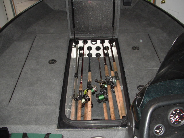 The 8' rod locker will fit about as many rods as you'll need for any week on the water (dont remember the exact number), and there is enough storage for any two people. A cooler sits up front, with a 50" livewell in back. The rear deck extension is a must for anyone considering a console model, as it not only gives rear casting deck space, but serves as a great storage place. Though not waterproof in back (it is everywhere else) it makes a great place to store PFDs, tools, rod holders, etc.