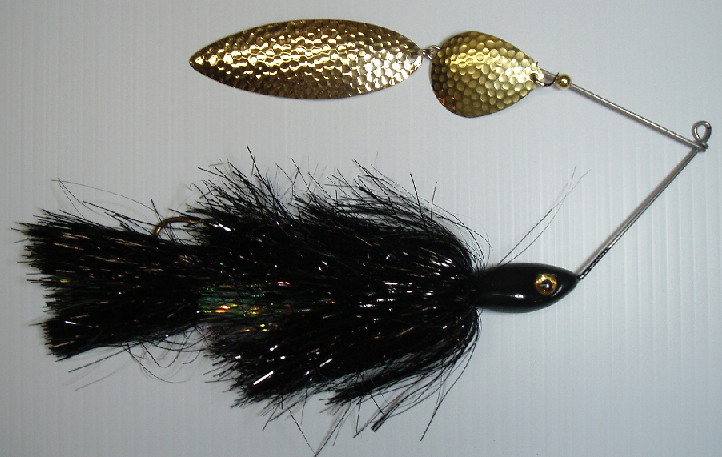 Location: Black Creek, WI | I guess customs don't always need to be exotic. Here is a pair of heavier 2 oz. DoubleShots in a simple Black Flashabou and Gold Blade combination. A little more weight (2.0 versus 1.5 ounces) and less bouyant body (Flashabou vs. Hair) should keep these puppies right in the strike zone at pretty fast clip!