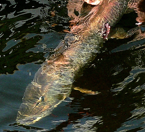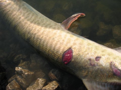 | Here is a photo I took of a 50" fish in the Minaki area last year. I blew it up, so the photo quality is bad, but you can see where this fish was struck by a prop. The fish seemed healthy, even though the gash was so deep you could see bones and such sticking out.
