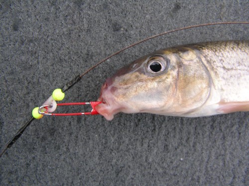 Location: Pewaukee, Wisconsin | Here is my rig. The small hook goes into the skin just below the nose holes and out. The second and third hooks go on each side of the sucker.