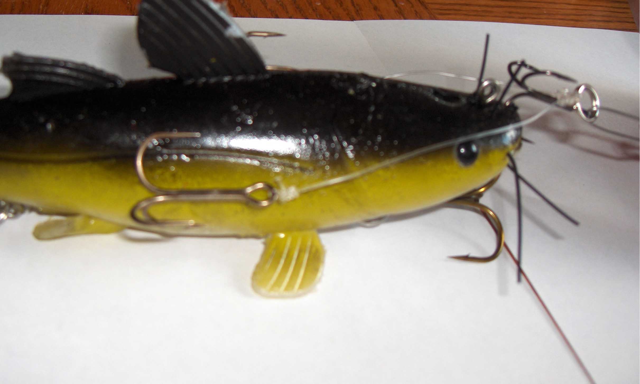 I will upload another picture with my rig on a rubber bait I have here. At least you can see how it hooks up to the sucker even though it's a bullhead lure. The hooks in the side must be just under the skin and out with only a little skin for little hooks and just a but more for larger suckers. If you go through too much skin the sucker will not tear free, if you don't do enough it will allow the hooks to dig into the sucker on the hook-set.