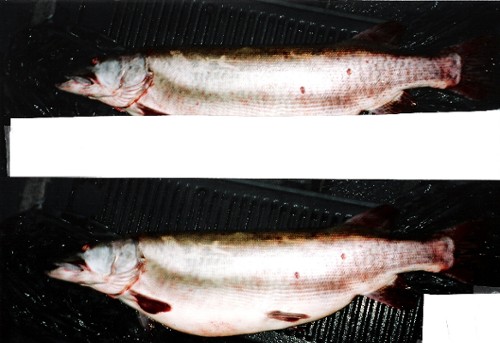 Also, if you look at the visual aid you will see how sunken the midsection is, while in similar pictures I have of it lying on its side directly after it was captured it has a slight (and natural) outward bulge. I'm sure most of you understand where I'm going with this now and any further information would be greatly appreciated. I would very much like to talk to Tom because this information has the potential to be very important down the road if placed in the correct hands, which I intend to eventually do. I would also like to talk to a biologist, or anyone else who might have similar pertinent information on any other before and after large girth muskies as well. [email protected]