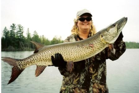 Location: Muskegon Michigan | I believe the longest on record was a 66 incher from Lac suel. It was under 50 lbs. Ken obriens 65 was verified. The supertankers are there and they are catchable and someone will eventully put her in the boat. I know of one man who has done it twice but has released her both times. You all know his name so I wont say it on a public forum. The Larry, Georgian Bay, The Ottawa and now I believe Green bay or Lake Michigan could put a 70 lber on the wall. Here is a picture of a great lakes spotted fish caught by my wife in 2004. It was 47 inches long and weighed between 25 and 28 lbs. It had been dog boned by a freakin monster that ripped its flesh back on both sides of the body. The side facing my wife was torn all the way to the belly from huge teeth. The range of width of the bite was between 9 to 11 inches . This was a upper 20 pounder that was thrashed and severely damaged by another huge Musky. They exist and its just a matter of time before one blows the Spray fish off the map. Kingfisher
