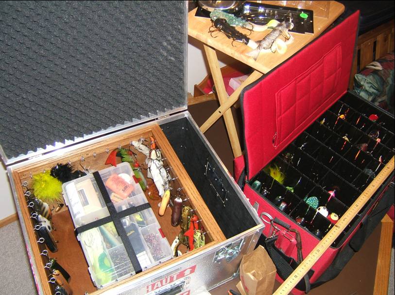Location: Minnesota | Here is my new box again. Finally finished it with the some Velcro straps. Nice when you take the Plano boxes out. Full range to look and grab lures instead of like My Lakewoods box. I can drop all the lures I want in this one and not get hooked getting them. I did not think it was that big until I put it next to my full size Lakewoods box. I can get 40 bait on my screw eyes and then 4 full size 3 inch deep Plano boxes in the aluminum monster. Has roller wheels too and one of those pull out handles. LOL I will be the fanciest angler on the lake. I think this will be my soft/Dawg and glider box.