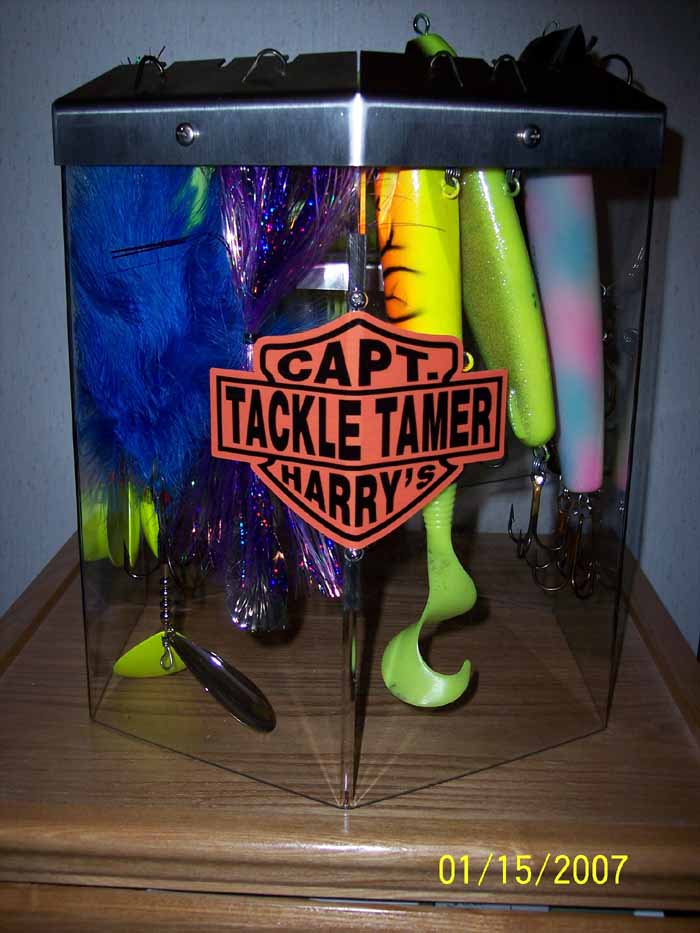 | Here is a pic of my Captain Harry pedestal box. It'll hold eighteen baits. It's all Lexan and stainless steel. They are very tough.