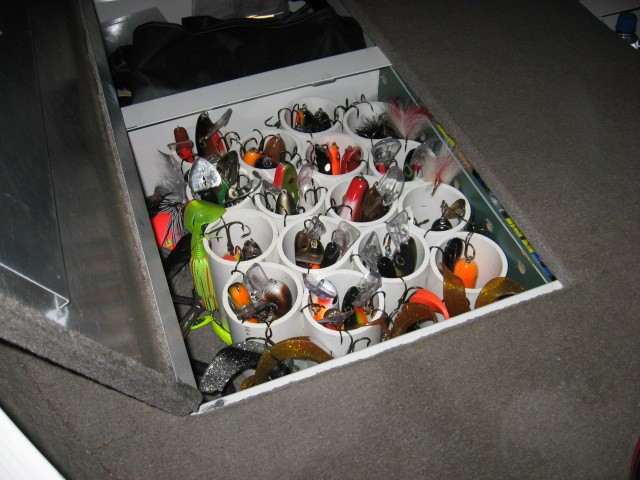 | Ditto on the PVC. Cheap and easy to customize. Converted a compartment into bait storage with 3" PVC. Also have 3 4" PVC tubes glued together that I keep on the front deck for the favored lures of the day. Also have a duplicate one for guests in the back of the boat. Anything to cut down on clutter. It is amazing how fast you can shrink a 17' boat by having too much gear laying around.