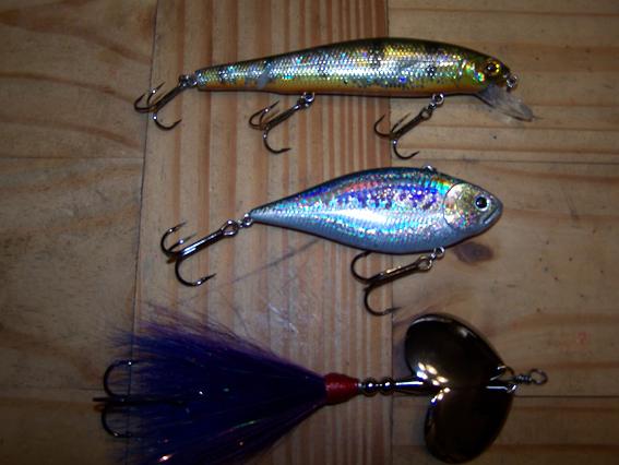 Holoform cranes, mepps magnums and number 5 tandems, grinders, smaller prop baits, baby docs, 7 inch grandmas, small gliders-smuttly dogs, magic makers, (old reliable 9 inch suicks), orange rattle traps. Baby cranks too! Few! To many to list! Out of these the best or first bait I toss out of the box is a mepps magnum single or tandemed tail, and fish shallow around sand and weed edges! Thats key!