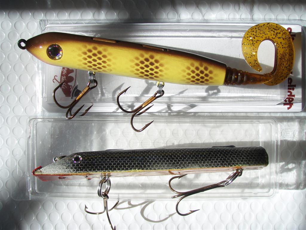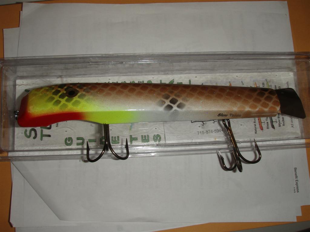 Location: north central wisconsin | I have three new lures for sale. The first is a walleye slippery slider(I have another similar lure and the new one just hangs in the basement). The second is a reproduction of the old L&L Exciter. It has a tough epoxy finish and an added metal plate over the nose to aid in protecting it from the usual rock mushrooming effect. the third is a Slow Tease, 3.1 oz in natural sucker.