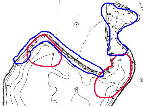 | Primary targets in early spring would first be the flooded trees on (what I presume to be) the north end/arm. I'd focus on the corners where fish might sit and be able to ambush prey better than cruising the flat area between the corners. However, I would definatley fish the area in between. The shoreline leading into the north corner (with the red circle by it) also caught my eye. Could be a staging area for fish fresh from spawning.