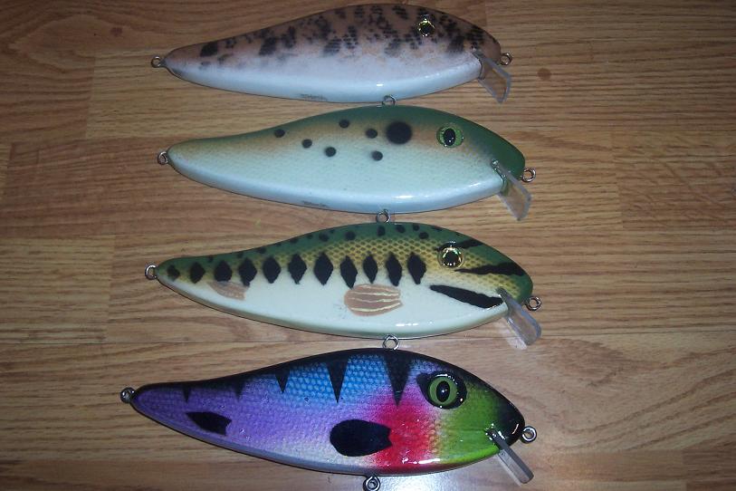 I thought i'd show some more bait pics. 10" sunnys, 4 oz, shallow divers. Along with some jointed minnows that are also 10" just under 4 oz. Also here's a new bullfrog I made total new design from previous I think it looks even more realistic. Hope you like them.