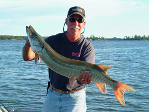 | K-man – I had most of my luck fishing wind blown rocky points off of mid-lake islands. If you find a combo of rock and vegetation it is even better. If you find some good cabbage hit it because our two biggest fish came out of it, a 51” and a 47”. We also lost some big ones in the cabbage. Orange and black, and believe it or not orange and white were the top producers. The 51” was caught on an orange and white bucktail called the Jerry (www.nugtackle.net). 47” was caught on a Loon Top Raider (www.joebucher.com). I also caught a few on Orange and black M&G spinner (http://lindyfishingtackle.com/pages/MG_Lures.shtml).