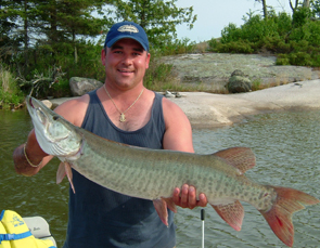 | Fished Sabaskong from 7/7 to 7/13. Fishing was tough this year. The big cold front, including 3 inches of rain on Tuesday, definitely did not help. Fish were scattered. Biggest fish we managed was 41", though we had shots at some bigger ones.