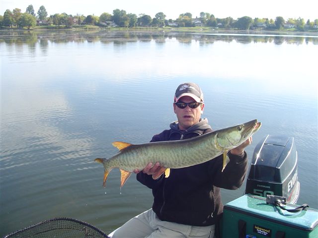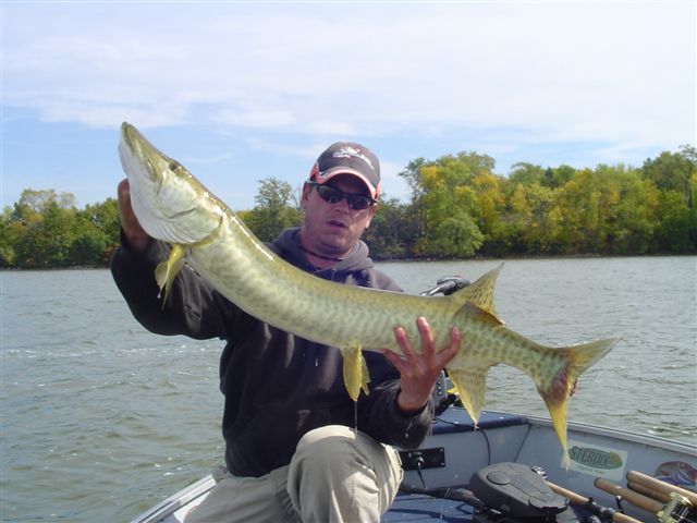 Location: oswego, il | Fished sunday and did ok. My buddy last a 35 that went airborn and he had three follws and a blowup on a rumbler. I caught my biggest bass ever on a home made 14" bucktail and did not see a musky untill 630pm. After that follow I hooked a fish only to watch all 45" of it come out of the water and toss my bait half way back to the boat. About the 10th fish of that size or bigger I have lost this year. I contemplated about 20 seconds over what needed to die. I hit my hooks quick with a file just to be sure, made my next cast and caught the musky pictured below. That was the last action we had.