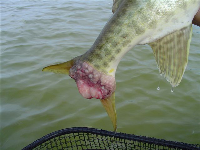 | Fished cameron lake on saturday with my buddy Mat,he boated two fish and i myself got three all small fish under 40"s.Lost one good one that day about mid 40s on a big joe.Picked up my friend Brad for some lake scugog action on sunday,Brad put two in the boat and missed two fish the second fish Brad landed was areal horse maybe a fifty incher if not very high fortys with good girth no measurments taken but a real pig i will post some photos of this fish and several others taken sunday as soon as he emails the pics to me.I myself landed three and missed two.Two of the fish were decent one was on the small side,the one fish was in the mid forty inch range and had two really gross growths on it,the smaller fish i got in the same area had similar growths but not as developed,these were large tumors,some really nasty stuff,i took some close ups of this stuff which i will also post when i get the pics. |