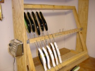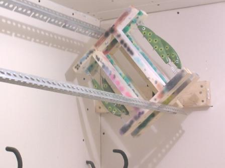 I stop the system just long enough to set a rack in tighten the wing nut and its running again. The racks that hold the lures are like an H but have two center posts . The epoxy is applied while setting in a set of holders so I can turn the rack while painting and top coating. It is a real nice system and works great. here are some pictures in operation. Kingfisher