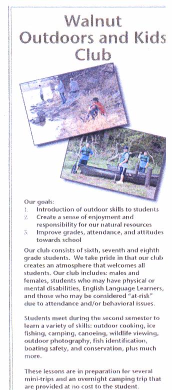 And it was...big time! The Club is comprised of approximately 75 Walnut students, and four adult sponsors. The Club meets twice weekly, and offers several mini-trips and one overnight camping trip at no cost to any student willing to learn a bit about the Great Outdoors. The Curriculum includes: