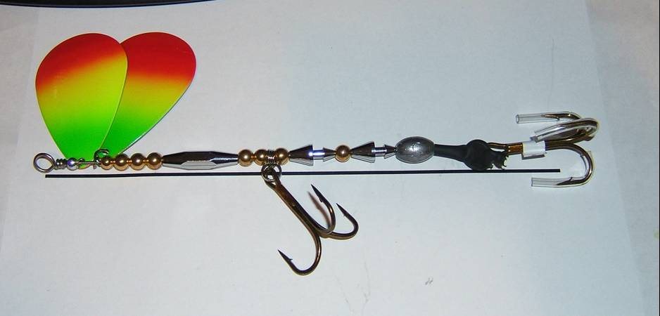 Location: On your favorite spot | Hi, if I'm understanding right, you seem to be building your baits from the top down. Try it from the bottom up, it'll improve spacing I think conceptually, it's a little easier to organize. There shouldn't be any exposed wireshaft anywhere but above the blades.