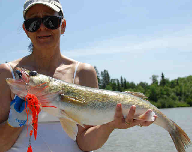 A conservation limit of 4 walleyes is in the fridge, plus an 18" smallie and a 4# white sucker also joined us. We caught about 25 'eyes, none over 18", which is perfect. Sue smacked 'em around pretty good vertical jigging. Walleye for dinner after we search out a few toothy critters this afternoon, then an evening of surface baiting for Muskies.
