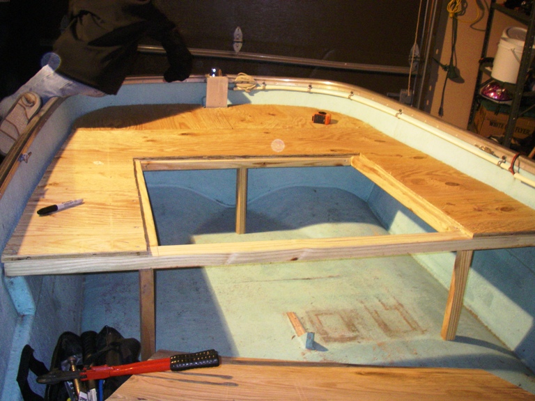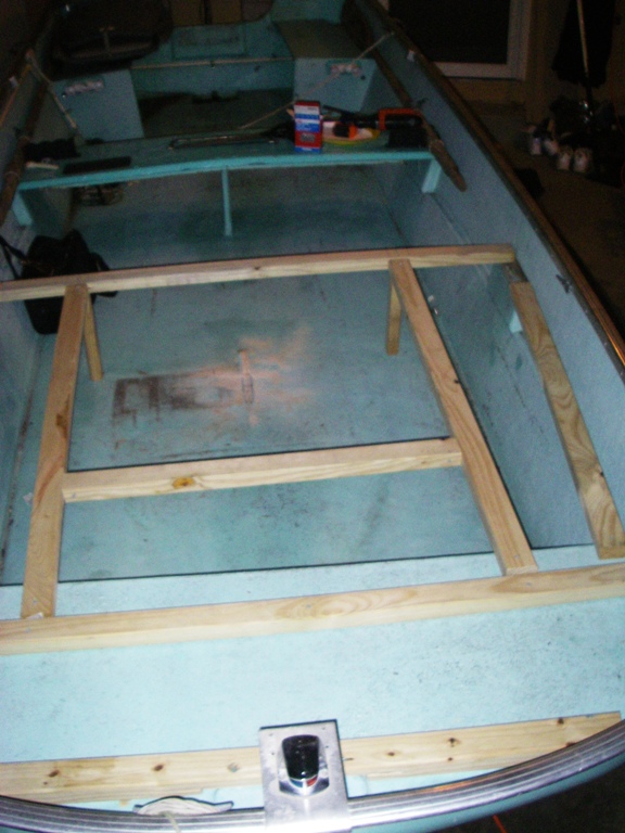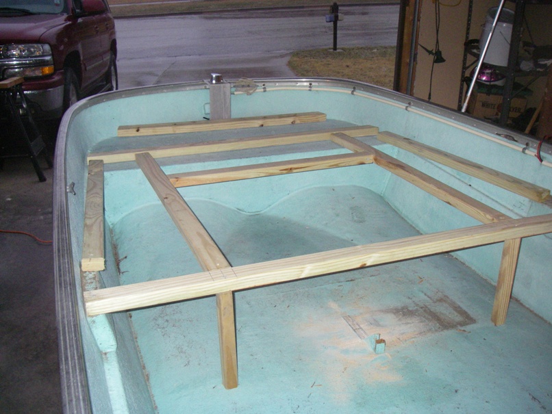 I will say up front I am not a carpenter...so it ain't pretty but it works. If you look at the lund vs this boat you will notice I had to anchor the front deck differently and actually build up the very front of the shell lake deck over the lund since the anchor point on the shell is a lot higher then the lund was. Also I think I over build the lund front deck, and this time I downsized on the framing. I got up on it after I laid the decking and it was stable to me.