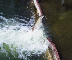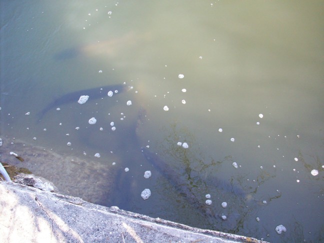 Location: Twin Cities | I was there this afternoon, got 30-40 pics, some will turn out alright. There were no less than 3 fish that were 48" plus, if indeed the cement pilings are that wide as suggested by a gentleman there. Saw a couple try and jump it, not even close. Some of those fish are looking really beat up, there was a small one COVERED in white/infections and looking pretty morbid.