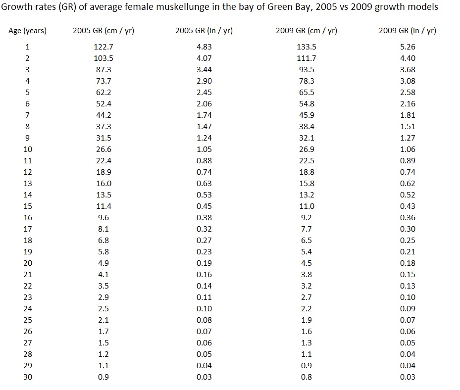 Location: Green Bay, WI | I received some updated data from our local fisheries biologist about two weeks ago. The data included the newest growth model for the population in the bay of Green Bay, through 2009. To his knowledge, this is the latest revision of the growth model that exists. Therefore I have calculated the average length at age of female muskellunge in this population, using both the original model (2005, referenced above) and the newest model. The results are shown in the two tables I am attaching to this post.