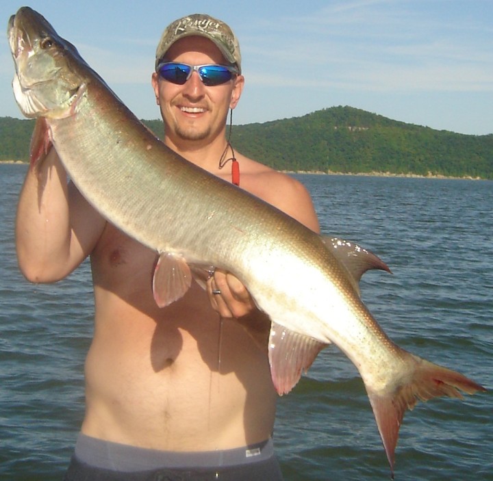 Location: Kentucky | I got out yesterday 4 awhile. They are suckin the bottom out of the lake. Falling around a half a foot a day. Still 8 feet over summer pool. Clarity is murky in beaver and alot of the mainlake, clearer up around the dam. Water temps anywhere from 68-70. Bluebird skys and east wind kind of limited the Muskies activity level for most of the day. I ended up getting a low 30 incher then this 43 incher in a short feeding window around moonset. The little one ate a baby depthraider and the bigger one ate one of my homemade spinnerbaits. Theres still some floating debris out there so be careful running around.cpr Chris