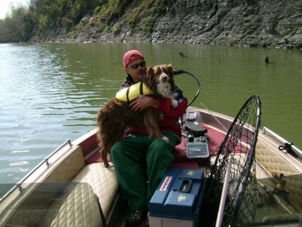 Location: New Albany, Ind. | hey guys, my dog bubby red merle aussie just loves to go with me, the ranger very rarely leaves the house without him. he gets very excited way before im ready to go. he loves to lay in the dip net so lots of the time i dip it in the water to get it wet for him. he can be layed under the dash sleeping in shade and when you get a hit he is right at your feet. lots of the time its just me and him ready to go anytime i am. ron